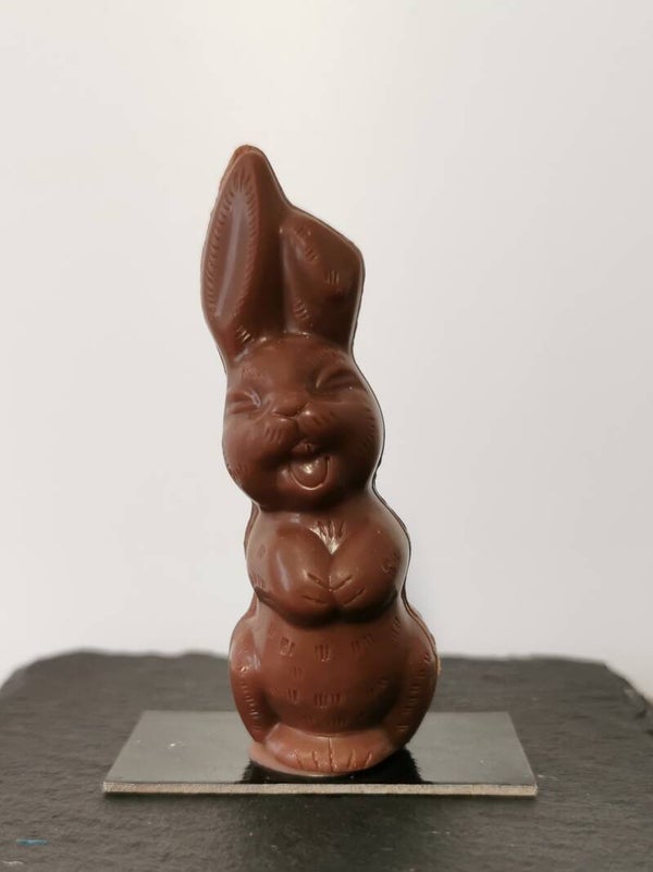 Das kleine Häsli wird von Hand aus feinster schweizer Milchschokolade gegossen und gefüllt mit einer zarten Pralinencreme auf Haselnussbasis.